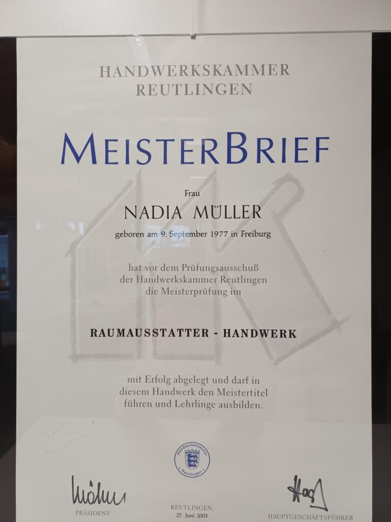 AUSGEZEICHNET Basierend auf 43 Bewertungen Katharina Evers9. März, 2025Trustindex überprüft, ob die Originalquelle der Bewertung Google ist. Wir haben unser Haus mit Waben Plisses und einer Lamellenanlage verschönert. Wir sind sehr zufrieden mit dem Ergebnis! Wir können Müller Raum & Ausstattung bestens empfehlen! Die Kombination aus kompetenter Beratung, sorgfältiger Planung und professioneller Montage macht den Kauf zu einem rundum positiven Erlebnis. Vielen Dank! K K (caad9)31. Januar, 2025Trustindex überprüft, ob die Originalquelle der Bewertung Google ist. Gardinen, Lamellen, Bilderschienen, Insektenschutz - alles bestens. Von der Auswahl bis zur Installation perfekt betreut. Wir haben Freude daran. Silvia Mitternacht15. Januar, 2025Trustindex überprüft, ob die Originalquelle der Bewertung Google ist. Sehr gute zuverlässige Polster Arbeit 👏 und die Abwicklung der bestellten Ware war auch sehr zufriedenstellend.ein Lob an die freundliche Geschäftsführerin Nadja👍 Maria-Luise Bodirsky14. Januar, 2025Trustindex überprüft, ob die Originalquelle der Bewertung Google ist. Frau n. Noth ist eine freundliche und kompetente Raumausstatterin, die ich gerne weiteremphehle. Auswahl und Montage der Lamellenvorhänge an einem schrägen, hohen Fenster verliefen völlig unkompliziert und zügig. 5 Sterne ! David Sexauer14. Januar, 2025Trustindex überprüft, ob die Originalquelle der Bewertung Google ist. Frau Noth hat ein tolles Gespür für Raum und Ausstattung. Die Arbeiten wurden pünktlich und sehr gut ausgeführt. Sehr zu empfehlen. Jutta Schwarz13. Januar, 2025Trustindex überprüft, ob die Originalquelle der Bewertung Google ist. Für meine Wohnung benötigte ich neue Vorhänge. Frau Noth hat mich im Geschäft (Terminvergabe) sehr gut beraten, hat meine Wünsche gleich verstanden und mir eine schöne Auswahl im Geschäft gezeigt. Bei demTermin vor Ort erhielt ich sehr kompetente Beratung und tolle Tipps. Da war wirklich eine Fachfrau am Werk. Montage bestens und ein gutes Preis-Leistungsverhältnis. In dieser Firma sind Freundlichkeit und Fachkompetenz Trumpf. Gerne wieder! Vielen Dank für Ihr "rundum-sorglos-Paket", liebe Frau Noth! Winfried Ballach13. Januar, 2025Trustindex überprüft, ob die Originalquelle der Bewertung Google ist. Wir sind vor zwei Jahren von Berlin nach Breisach umgezogen, und haben alle unsere Fenster mit Gardienen und Insektenschutzgittern der Firma Müller ausgestattet. Wir können diese Firma nur weiterempfehlen. Von der Beratung bis zur Ausführung der Arbeiten haben wir uns in guten Händen befunden. Eine pünktliche ,schnelle Bearbeitung unsere Wünsche und Vorstellungen wurden in sehr guter Qualität umgesetzt. Wir hatten in Berlin auch eine Firma die uns aber lange nicht so vorbildlich betreute wie Frau Noth es getan hat. Anja Spiegelhalter13. Januar, 2025Trustindex überprüft, ob die Originalquelle der Bewertung Google ist. Freundliche Beratung und schnelle Abwicklung und Montage! Stefan1. Oktober, 2024Trustindex überprüft, ob die Originalquelle der Bewertung Google ist. Wir haben am 01.10.2024 die Plissees von Müller Raumausstattung in Ihringen gekauft. Super gute Qualität und sehr schelle Lieferung. Herzlichen Dank an das Team Arno Korppi25. Juli, 2024Trustindex überprüft, ob die Originalquelle der Bewertung Google ist. Tolle Arbeit, super nett, schnelle und präzise Ausführung! Es ist bereits die zweite Wohnung die wir mit Plissees von Frau Noth ausgestattet haben. Jederzeit gerne wieder!👍Verifiziert von: TrustindexDas verifizierte Trustindex-Abzeichen ist das universelle Symbol des Vertrauens. Nur die besten Unternehmen können das verifizierte Abzeichen erhalten, die eine Bewertungsnote über 4.5 haben, basierend auf Kundenbewertungen der letzten 12 Monate. Mehr erfahren